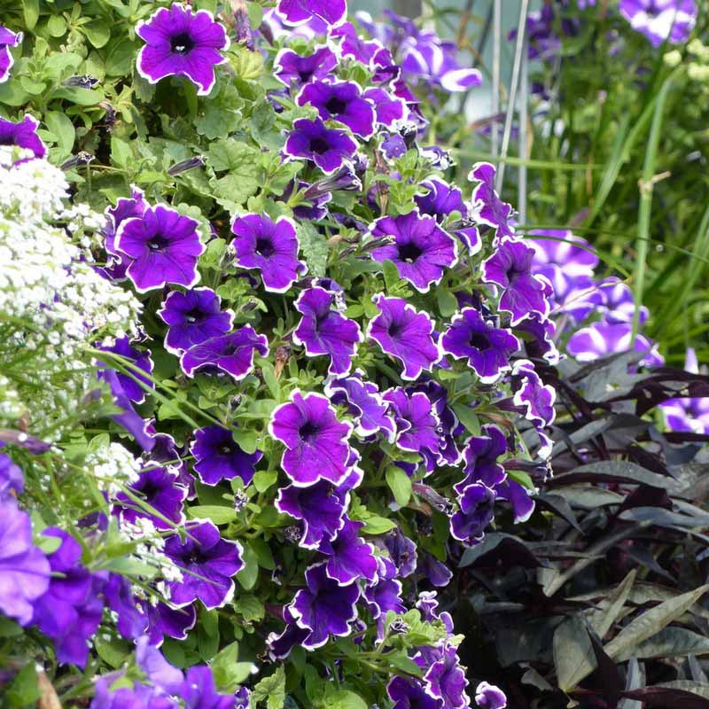 Et le meilleur pour la fin ! C'est (encore, me direz-vous !) un pétunia : 'Blue Picotee' nous vient d'Angleterre, où il a été créé par David Kerley, le célèbre obtenteur du pétunia 'Priscilla'. Il impressionne par ses grandes fleurs d'un beau bleu indigo, délicatement ourlées d'un fin liseré blanc qui leur confèrent un relief extraordinaire. C'est un vrai retombant, qui ne "creuse" pas au centre, et qui fleurit tôt et longtemps. Découvrez-le aussi avec son écrin de feuillages dans notre nouvelle collection exclusive 'Indigo Cascade'.
