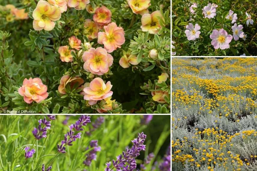 N’hésitez pas à l’associer à des plantes romantiques grimpantes comme des rosiers botaniques qui rappellent ses inflorescences. Elles s’immiscent parfaitement avec les feuillages grisés de l’Helicrysum italicum, des lavandes, voire quelques graminées cuivrées comme les Carex testacea.