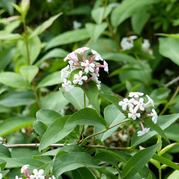 Nouvel ambassadeur du parfum dans cette sélection, voici l’Abelia Monia ! Peu connu et, par conséquent, peu planté dans les jardins, cet abélia aux puissantes effluves de lilas et de jacinthe est aussi l'un des plus résistants au froid. Précoce, il fleurit d’avril à juin, et ses couleurs d’automne sont fabuleuses. Quelques idées pour l’intégrer dans une petite haie parfumée ou dans un bosquet odorant tout au long du printemps et de l’été : avec les Kolkwitzia amabilis Pink Cloud, seringats (Philadelphus coronarius), le petite lilas Syringa microphylla 'Superba' et autres buddleias. Ou bien installez-le au milieu des plates-bandes d'automne, parmi les asters, anémones du Japon ...