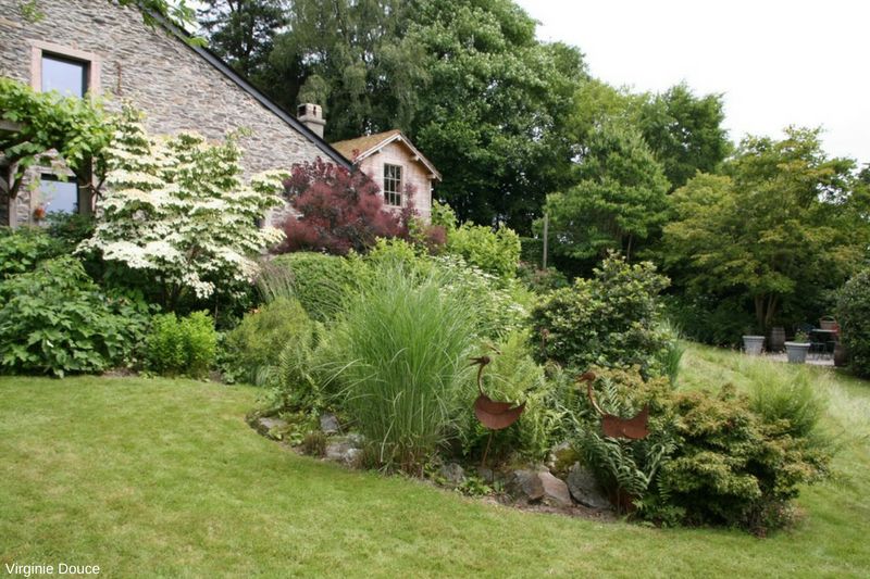 Dans une partie en sous-bois, je remarque la présence de nombreux hydrangeas, surtout des Hydrangea serrata, en un dégradé bleu et blanc. La terre est acide ici, ce qui permet d'obtenir des fleurs bleues, naturellement. Beaucoup de vivaces les accompagnent, des plantes solides et rustiques car dans l'Ardenne, les hivers peuvent être longs et rigoureux.