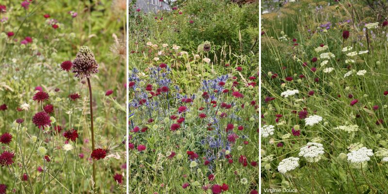 Quelques plantes d'allure sauvage : Knautia macedonica, Eryngium planum, Allium 'Forelock' et ombellifères