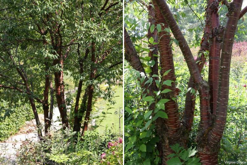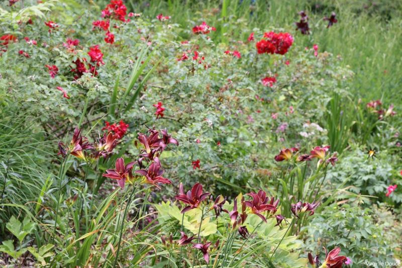 En ce mois de juillet, les vedettes sont les hémérocalles, les roses, quelques lis et les sanguisorbes qui donnent la réplique au magnifique érable au feuillage pourpre, ainsi qu’au Prunus serrula à l’écorce remarquable. Les rouges sont noyés dans des tonalités de verts et c’est comme ça que j’aime cette couleur.