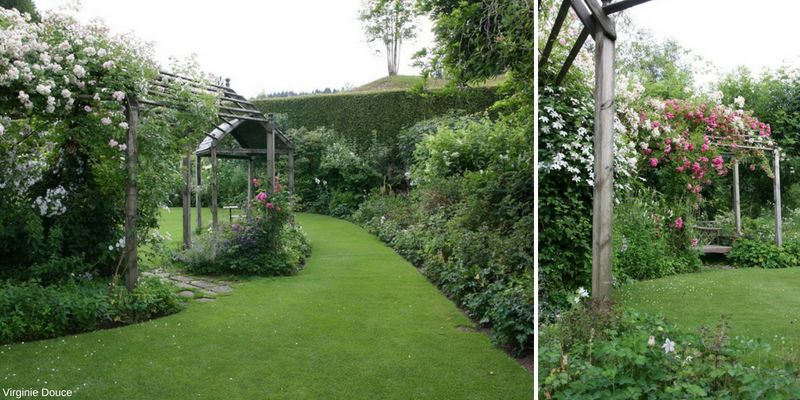 Il suffit de se retourner pour contempler une superbe pergola en bois, grisée par temps et ornée de rosiers et clématites. Sous son couvert prospèrent de nombreuses vivaces: campanules, galega, ancolies, corydalis, pigamons, géraniums vivaces... et j’en passe !