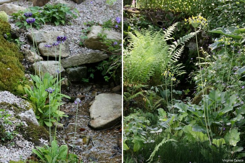 La rocaille fraîche nous conte l’histoire de ce jardin. En effet, les rochers sont les témoins de cette moraine glaciaire qui est sous nos pieds et de cette époque où Berchigranges n'était qu'une carrière de granit. L’histoire d’un jardin a son importance : ce sont ses racines, ce qui lui donne son âme. Les primevères s’y plaisent beaucoup, elles accompagnent des carex, des fougères, des hostas, des prêles… tandis que le ruissellement de l’eau sur les pierres encourage l’apparition de la mousse et des fougères.
