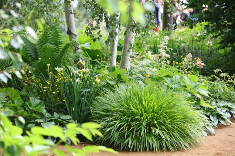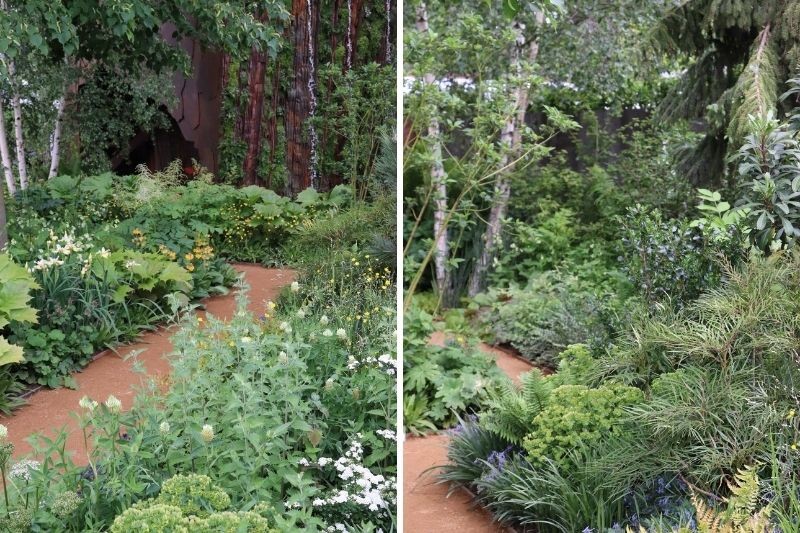 Voici un autre jardin incroyable, dans une atmosphère en lisière de forêt. Dans la végétation, on aperçoit un bâtiment fabriqué à base de bois durable et inspiré des strates rocheuses verticales naturelles. Trois chutes d’eau cascadent du sommet en pente dans un bassin en contrebas. On retrouve une sélection hétéroclite de plantes sauvages et naturalisées, qui apprécient les conditions humides. C’est un paysage foisonnant et apaisant. Au pied de bouleaux à l’écorce blanche prospèrent des plantes d’ombre humide tels les rodgersia ou les hostas dont les feuilles amples jouent avec celles plus fines des fougères, des astilbes, d'un superbe Mahonia eurybracteata, un Fatsia japonica ou des hakonechloas. Quelques fleurs (iris, boutons d’or, primevères japonaises, trèfle, Trollius et d'euphorbes) ponctuent les massifs verdoyants dans des tons de jaune, d'orange, de blanc avec quelques petites touches de bleu grâce aux Corydalis flexuosa. C'est frais, c'est beau, on en redemande !