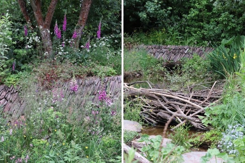Près d’un muret de pierre typique des paysages anglais, un ruisseau coule au milieu d’une clairière composée d’aubépines, de noisetiers et d’érables champêtre. En contrebas du ruisseau, un saule fendu abrite un barrage de castors, une espèce indigène réintroduite tout récemment dans le sud-ouest de l’Angleterre. Une passerelle en bois permet de traverser la prairie humide jusqu’à une cabane. On peut y admirer une grande diversité de plantes dont des fleurs sauvages indigènes : digitales, Persicaria bistorta, Iris pseudacorus, diverses fougères, myosotis, boutons d’or, Lychnis flos-cuculi, filipendules, Euphorbia palustris, ancolies et diverses graminées…