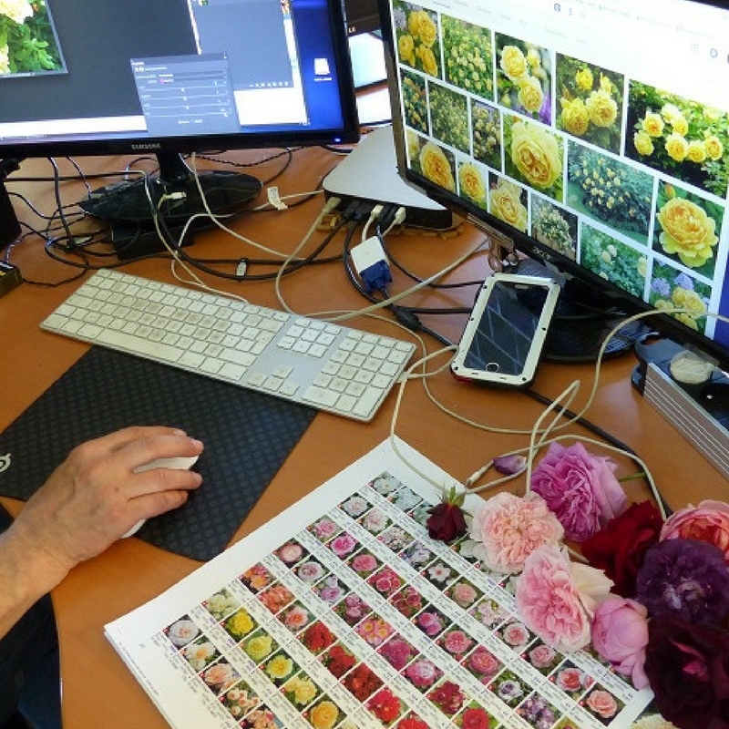 Il nous faut prendre en compte les contraintes liées aux techniques d'impression, savoir reconnaître un coloris inhabituel généré par une photo prise à un certain stade ou sous des conditions de lumière bien particulières, le corriger sans que cela ne se voie... Le fait d'avoir la pleine floraison des rosiers en ce moment nous a beaucoup aidés, mais cela reste un vrai travail de bénédictin, d'autant qu'en matière de couleurs, chacun a son interprétation, et cela vaut bien sur pour les mots mais aussi pour les images !