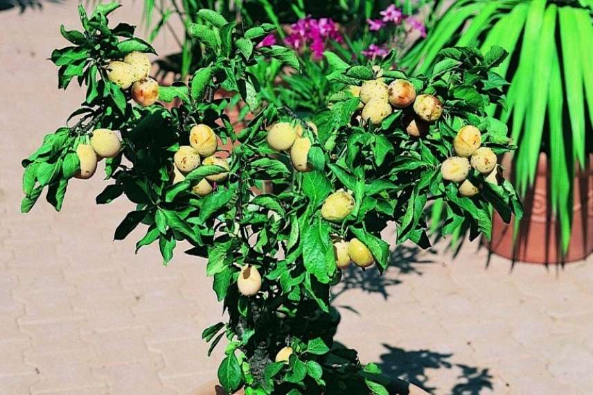 Cette variété naine de prunier est idéale pour vos balcons, car elle ne mesure naturellement pas plus de 1,5 m de haut à l’âge adulte. Elle est dotée d’une jolie silhouette à la fois compacte et élégante. Goldust® courod est autofertile et possède une mise à fruit rapide. Au mois d’août, il produit des prunes d’environ 4 cm de diamètre, jaunes, sucrées, à la chair parfumée. Pensez au drainage avec une couche épaisse de gravier au fond du pot et arrosez copieusement et régulièrement : en cas de manque d’eau, les fruits risquent de tomber prématurément.