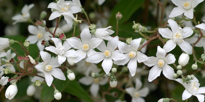 Le Deutzia setchuenensis ‘Corymbiflora’ se distingue des autres espèces par sa très longue floraison, qui dure 4 à 5 mois : il fleurit à partir de juin et jusqu’en septembre-octobre, avec parfois une petite pause en milieu d’été. Il offre de superbes fleurs étoilées blanches à cinq pétales, légèrement parfumées. Il s’agit d’une variété compacte, qui ne dépasse pas 1 m en tous sens. Il est parfait pour les petits jardins et s’adapte aussi à une culture en pot ! On apprécie sa floraison légère et délicate.
