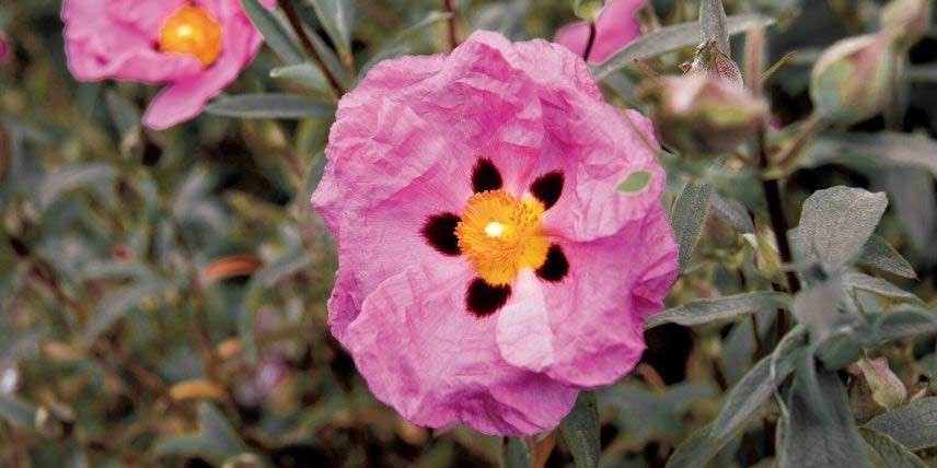Le Ciste est un arbuste méditerranéen bien florifère, qui offre, en général d’avril à juin, de belles fleurs à l’aspect chiffonné. Elles sont généralement roses ou blanches, avec au centre un bouquet d’étamines jaunes, et certaines variétés portent de belles macules sombres vers le centre de la fleur. Bien qu’elles soient éphémères, les fleurs du Ciste ne cessent de se renouveler. Ses feuilles sont épaisses, parfois gaufrées ou rugueuses, et souvent de couleur vert – gris. C’est un arbuste peu exigeant et peu sensible aux maladies. Il a néanmoins besoin d’un emplacement chaud et ensoleillé, et se destine plutôt aux régions de climat doux, où les risques de gel sont faibles. C’est un arbuste idéal pour un jardin de bord de mer !