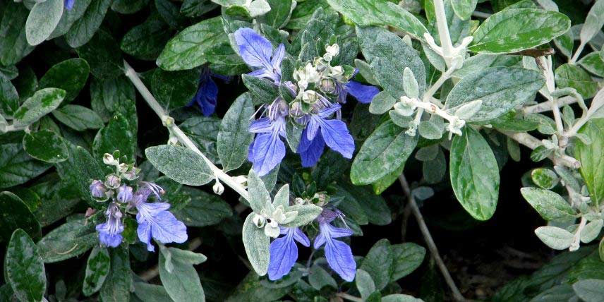 La Germandrée arbustive, ou Teucrium fruticans, est un petit arbuste, qui ne dépasse pas 1,50 m de hauteur, au port arrondi, bien touffu et ramifié. Il porte de belles feuilles ovales couvertes d’un duvet gris argenté. Elles sont légèrement aromatiques lorsqu’on les froisse. Il offre durant tout l’été de petites fleurs bleues (parfois même dès l’hiver dans les régions au climat doux). Comme le Teucrium supporte très bien la taille, c’est un arbuste que l’on peut tout à fait former en topiaire, comme le buis ! Nous vous conseillons de le tailler juste après la floraison pour l’inciter à se ramifier et prendre un port bien dense. Il supporte de courtes gelées de l’ordre de – 10 °C, et se révèle parfait en bord de mer ou dans un jardin de style méditerranéen.