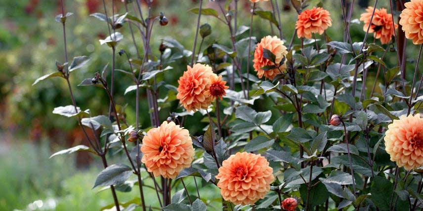Les dahlias offrent, eux aussi, une floraison très colorée, qui dure longtemps. Il existe un nombre incalculable de variétés horticoles, offrant des fleurs aux formes et couleurs très diverses. Les fleurs peuvent être de forme simple ou double. Le dahlia trouve facilement sa place dans un mixed-border coloré. Il se plait au soleil, dans un substrat riche, frais et drainant, de préférence à l’abri des vents forts. Comme pour les glaïeuls, en climat froid, les bulbes de dahlias doivent être rentrés à l’abri pour l’hiver et replantés au printemps.