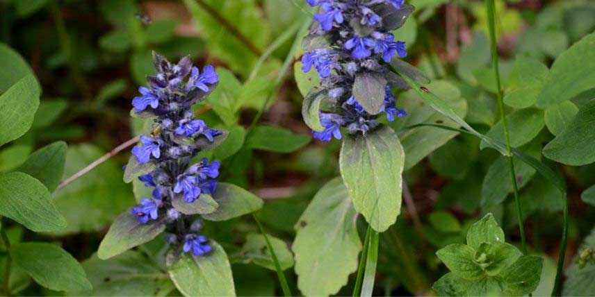 La bugle rampante, ou Ajuga reptans, est une vivace couvre-sol qui offre un feuillage vert pourpré, persistant, et une floraison bleutée. Elle s’étend grâce à ses stolons, et limite au passage la croissance des mauvaises herbes. Elle est assez basse, et dépasse rarement 20 cm de hauteur. C’est une plante que l’on peut facilement trouver à l’état sauvage en France. Ses fleurs sont bilabiées (formant deux lèvres), et sont regroupées sur de petites tiges dressées. Certaines variétés sont intéressantes pour leur feuillage pourpre très sombre (comme l’Ajuga reptans ‘Atropurpurea’), ou panaché (Ajuga reptans ‘Variegata’) ; d’autres se distinguent par leur floraison blanche (Ajuga reptans ‘Alba’), ou rosée (Ajuga reptans ‘Purple Torch’).