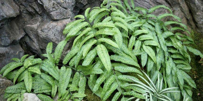 Les fougères sont des plantes qui apprécient les situations ombragées et relativement fraîches, et certaines se montrent particulièrement adaptées aux rocailles ! Elles sont irremplaçables pour apporter au jardin un aspect très naturel. Le Polypodium vulgare et l’Asplenium trichomanes se contentent de très peu de substrat et sont capables de pousser sur des murets ! On les trouve toutes les deux dans la nature en France, à l’état sauvage. Vous pouvez également choisir la Scolopendre, qui pousse parfois spontanément dans des zones d’éboulis ou sur de vieux murs, en situation relativement fraiche et ombragée. Pour un effet original, vous pouvez opter pour le Coniogramme emeiensis, qui possède des frondes vertes striées de jaune. Découvrez également le Cyrtomium falcatum, une fougère qui possède de grandes frondes découpées, vert foncé et brillantes, rappellent le feuillage du mahonia.