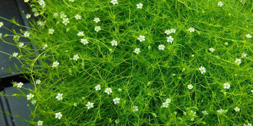 La sagine subulée (Sagina subulata) forme des tapis denses et uniformes, d’une belle teinte verte, ressemblant un peu à de la mousse. Elle se couvre au printemps de petites fleurs blanches, très simples, à cinq pétales. Elle couvre efficacement le sol, et remplira sans problème les espaces vides entre les pierres au sein d’une rocaille. Elle reste très basse, ne dépassant pas 5 cm de hauteur. Elle vous permettra de constituer un très beau décor verdoyant et frais, pour mettre en valeur d’autres floraisons plus colorées. La sagine est idéale également pour composer un massif d’inspiration japonaise, ou une rocaille au sein d’un jardin zen.