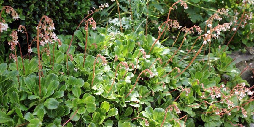 Les saxifrages sont de ravissantes petites plantes idéales pour les rocailles ou pour agrémenter un muret. Elles portent un feuillage décoratif, ainsi que de belles petites fleurs simples et étoilées, parfois réunies en inflorescences vaporeuses, très légères. Nous vous conseillons notamment le Saxifraga umbrosa ‘Variegata’, qui porte des feuilles vertes panachées de jaune et offre au printemps de petites fleurs blanches. Il se plaira à un emplacement frais et mi-ombragé. Le Saxifraga x urbium, lui, offre de belles feuilles vertes et des fleurs très délicates, de couleur blanc rosé. On l’appelle aussi « Désespoir du peintre », en raison du caractère extrêmement léger et vaporeux de sa floraison. Découvrez également le Saxifraga stolonifera ‘Cuscutiformis’, qui porte des feuilles originales, d’une teinte variant entre le vert et le brun, avec quelques nuances rosées et de belles marbrures blanc argenté. Il offre également de belles inflorescences, amples et vaporeuses, constituées de petites fleurs blanches. Enfin, à mi-ombre, choisissez le Saxifraga x arendsii, qui forme de petits tapis ressemblant à de la mousse et porte des fleurs roses, rouges ou blanches.