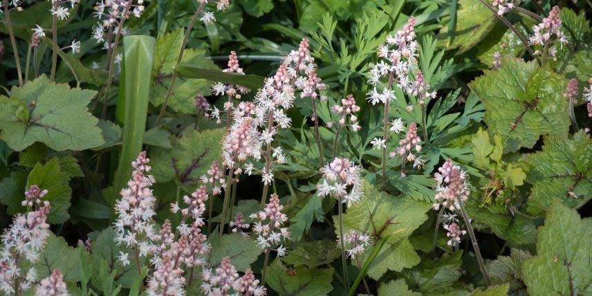 La Tiarella est une superbe plante au feuillage décoratif et à floraison vaporeuse. Elle offre au printemps des inflorescences légères, composées de petites fleurs blanches ou rosées. Les feuilles peuvent prendre différentes teintes : vert, jaune, bronze, pourpré… Elles sont palmées et ont des lobes plus ou moins découpés. Le feuillage des Tiarellas rappelle un peu celui des heuchères, dont elles sont très proches, et avec lesquelles elles peuvent s’hybrider pour donner les Heucherellas. Les Tiarellas se plaisent dans les terrains relativement frais, riches en humus, et légers. Nous vous conseillons notamment la culture de Tiarella wherryi, une charmante petite vivace à floraison blanc rosé et à feuillage vert tendre, plus ou moins marqué de brun le long des nervures.