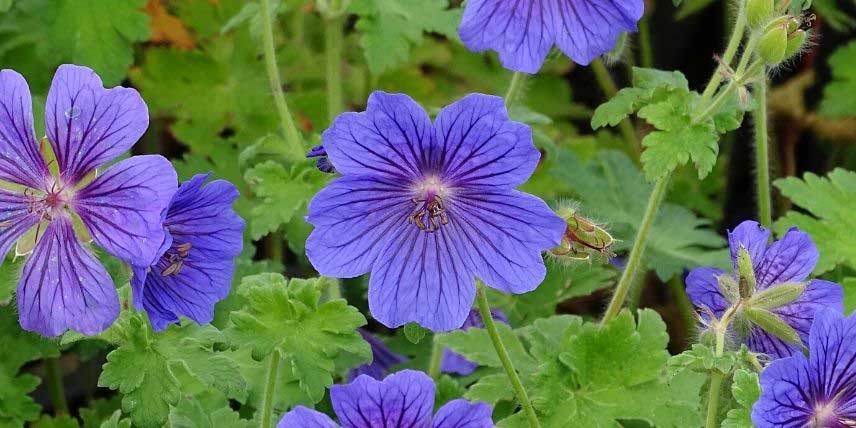 Les géraniums– à ne pas confondre avec les Pélargoniums – forment un très grand groupe de plantes vivaces rustiques, dont les fleurs se déclinent dans des teintes douces : bleu, rose, mauve, blanc… Ils sont faciles à cultiver et à entretenir. Pour une floraison en début d’été, nous vous conseillons en particulier le géranium des prés, Geranium pratense. Il existe plusieurs variétés à fleurs doubles. Certaines ont un feuillage pourpre, comme le Geranium ‘Black’n White Army’ ! Vous pouvez aussi choisir le Geranium renardii, qui porte de belles feuilles duveteuses, très douces. Il affectionne le soleil ainsi que les sols drainants et pauvres, et convient tout à fait à une plantation en rocaille. Découvrez aussi le Geranium magnificum. On apprécie ses fleurs de couleur violet – mauve très intense ! De plus, ses feuilles prennent de belles teintes orangées en automne.