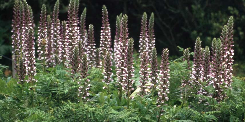 L’acanthe, ou Acanthus mollis, est une plante vivace majestueuse, portant de superbes et amples feuilles, brillantes, vert foncé. Elles sont joliment découpées. En été, l’acanthe porte également de très grandes hampes florales dressées, majestueuses, constituées de fleurs blanches et pourprées. C’est une plante vigoureuse, qui pousse rapidement, et qui est plutôt facile de culture. Elle se plait au soleil ou à mi-ombre, et supporte bien la sécheresse. L’Acanthus spinosus est une autre espèce intéressante par ses feuilles épineuses et très découpées.