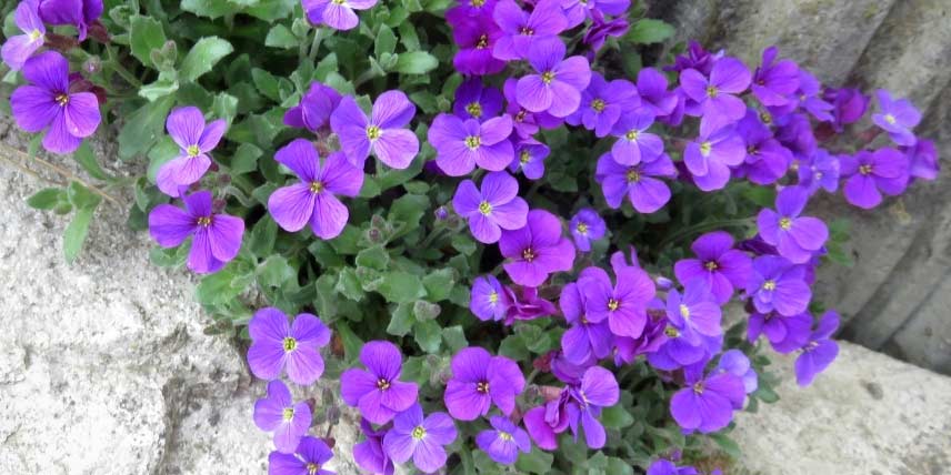 L’aubriète est une petite plante tapissante, qui se couvre au printemps d’une multitude de fleurs roses, mauves ou blanches. Ses feuilles sont persistantes, et restent donc décoratives en hiver. Elles sont habituellement vertes, mais il existe aussi des variétés au feuillage panaché. L’aubriète est une plante qui reste très basse, ne dépassant pas 15 cm de hauteur. Elle est idéale pour apporter beaucoup de couleur dans un massif, une rocaille, ou sur un muret. Nous vous conseillons de l’installer en plein soleil, dans un substrat plutôt pauvre et drainant.