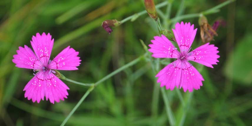 Les œillets offrent de ravissantes fleurs colorées et parfumées, pouvant être simples ou doubles. Il en existe de nombreuses espèces et variétés, qui se plaisent en plein soleil et en terrain drainant. Ils sont intéressants également en fleurs coupées, pour réaliser des bouquets. Au jardin, dans un terrain calcaire, nous vous conseillons notamment l’œillet à delta, Dianthus deltoides, offre de belles petites fleurs simples, à l’aspect plutôt naturel. L’œillet mignardise (Dianthus plumarius), lui, offre de délicates fleurs dont l’extrémité des pétales est frangé, denté. On apprécie également le Dianthus carthusianorum pour sa superbe floraison, au style délicat et très naturel. Vous pouvez cultiver ces différentes espèces d’œillet en massif ou dans une rocaille. Il existe aussi des espèces annuelles, comme l’œillet des poètes, Dianthus barbatus.