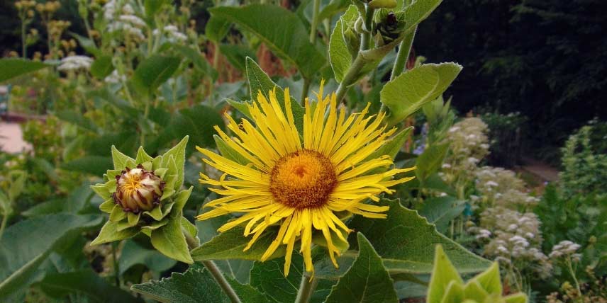 La Grande Aunée est une vivace imposante, qui peut mesurer jusqu’à deux mètres de hauteur. Elle fleurit en été et porte alors de grands capitules, ressemblant à des fleurs de marguerite, mais de couleur jaune doré. Vous pouvez l’installer à l’arrière d’un massif, derrière des plantes plus petites. Elle se plaira au soleil ou à mi-ombre, sur un terrain frais et fertile. Il s’agit d’une plante particulièrement robuste et vigoureuse, ne demandant que très peu d’attention. De plus, elle possède une racine comestible et médicinale !