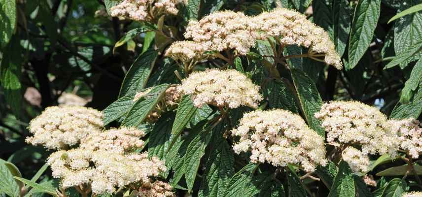 • Le Viburnum rhytidophyllum : si vous souhaitez un viburnum qui reste vert durant la mauvaise saison, optez pour cette espèce de grande viorne chinoise arbustive. Ses grandes feuilles gaufrées et pendantes, d’un vert sombre et brillant, lui ont valu le surnom de « Viorne à feuilles ridées ». C’est un grand arbuste persistant qui atteindra 3 à 5 m en tous sens à maturité, parfait en haie libre. Au printemps, il se couvre de petites fleurs de couleur blanc-crème suivies d’une jolie fructification rouge. Rustique au-delà de -20 °C, il ne demande pour s’épanouir qu’une exposition ensoleillée et un sol assez profond et pas trop sec.