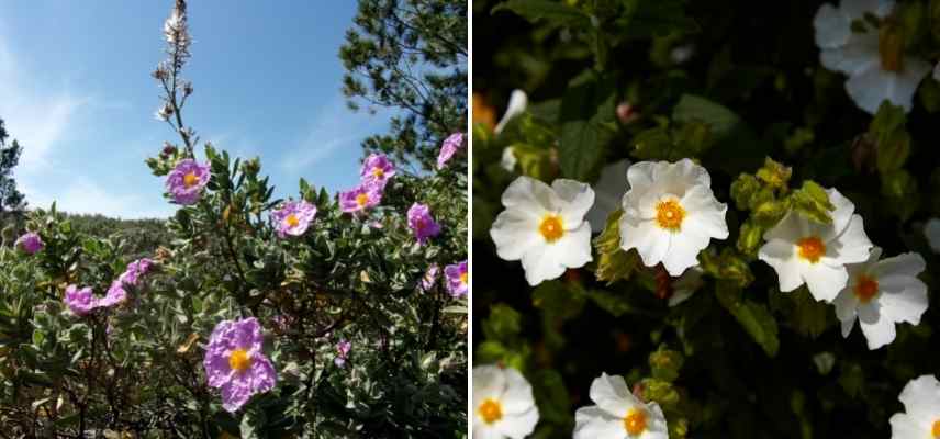 • Le Ciste : ce petit arbuste de garrigue typiquement méditerranéen forme de belles touffes buissonnantes intéressantes pour leur feuillage persistant. La couleur des feuilles varie selon les variétés, du vert argenté duveteux (Cistus albidus), en passant par le panaché du Cistus (x) corbariensis. Très florifère, du printemps à l’été, il se couvre de fleurs d’églantines, principalement blanches ou roses. Parmi les plus rustiques, on trouve le Cistus salviifolius, le Ciste des Corbières, le Cistus x pulverulentus qui peuvent résister jusqu’à -12 °C, voir -15 °C, en sol bien drainé et en situation ensoleillée et abritée. Il pousse en plein soleil et uniquement en sol bien drainé. On réserve néanmoins sa culture en pleine terre aux climats doux. C’est un arbuste parfaitement adapté à la sécheresse, parfait dans les jardins épargnés par les fortes gelées. Polyvalent, il s’utilise en arbuste pour massif de plein soleil, haie libre, bordures, rocailles sèches, pour garnir un talus ingrat ou même sur une terrasse ou un balcon au soleil dans nos régions les plus froides.