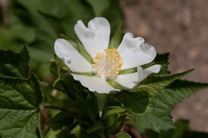 Kitaibelia vitifolia est une vivace de la famille des Malvacées totalement méconnue. Et c’est une grande injustice ! D’une souche épaisse naît une grosse touffe de tige dressées et habillées de grandes feuilles de vigne vert sombre. Les fleurs d’un blanc pur, semblables à celles de la mauve, s’épanouissent à l’aisselle des feuilles entre juin et octobre. Elle apprécie tous les sols pourvus qu’ils soient assez profonds, sinon elle se moque de l’exposition que vous daignez lui réserver comme de l’humidité du sol : frais ou sec, peu importe. Une plante sans soucis que l’on peut oublier dans le coin le plus sauvage du jardin et qui s’offrira même le luxe de se ressemer par-ci, par-là. A noter, que les bourdons semblent vouer un culte à ses fleurs…
