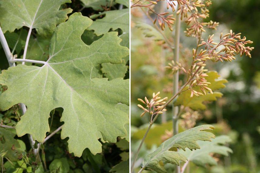 Macleaya cordata ou Bocconie cordée (ou encore “Plume Poppy” qui veut dire “pavot à plumes“) est une énorme vivace rhizomateuse originaire d’Asie et appartenant à la famille des Papaveracées (comme les pavots et les coquelicots). Son feuillage est constitué de grandes feuilles lobées d’un beau vert bleuté. Sa floraison intervient en juillet-août en imposantes panicules plumeuses composées de petites fleurs pendantes de couleur passant du blanc crème au blanc légèrement rosé pour faner à l’automne dans une belle teinte rousse. Installez-là en isolé ou au centre d’un massif mais n’oubliez pas qu’il lui faut de la place. Elle apprécie le plein soleil et se plait dans n’importe quel sol ordinaire si possible un peu frais. Attention toutefois, de la protéger des vents violents qui abîmerait son feuillage et sa hampe florale.