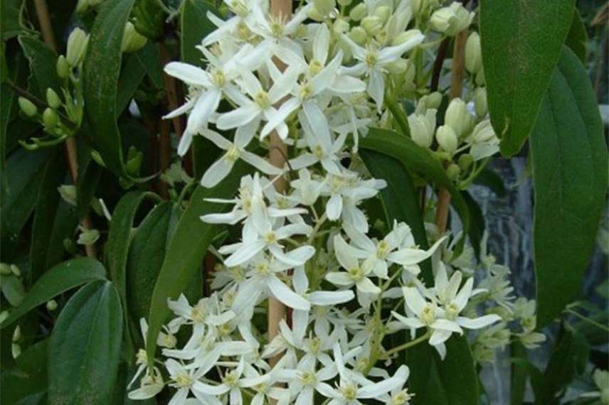 Sa floraison est une véritable nuée de petites fleurs très légères à 4 sépales d’un blanc pur, chaque fleur mesurant environ 5 cm. Elles sont groupées en panicules terminales, recouvrant de leur blancheur le manteau vert que forme l’abondant feuillage allongé vert foncé vernissé. Le port de cette clématite est vraiment magnifique et dégage un charme absolu.