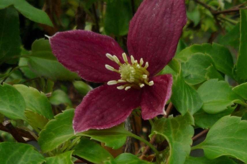 D’un coloris peu répandu chez les clématites à floraison hivernale, la clématite cireuse ‘Landsdowne Gem’ a tout d’un petit bijou : ses fleurs se présentent sous la forme de 4 sépales d’un coloris rouge bordeaux, absolument unique parmi les clématites d’hiver, et d’étamines crème contrastantes. Les sépales sont en réalité largement tachetées de pourpre au point de colorer complètement la fleur, les bords restant souvent légèrement crème. Les grandes fleurs assez ouvertes sont d’un diamètre d’environ 7 cm, autre caractéristique la distinguant des autres clématites à floraison hivernale, qui se présentent plutôt sous la forme de clochettes pendantes. Ce coloris pourpré est une aubaine au coeur de l’hiver où le jardin recèle peu cette palette de couleurs fortes.
