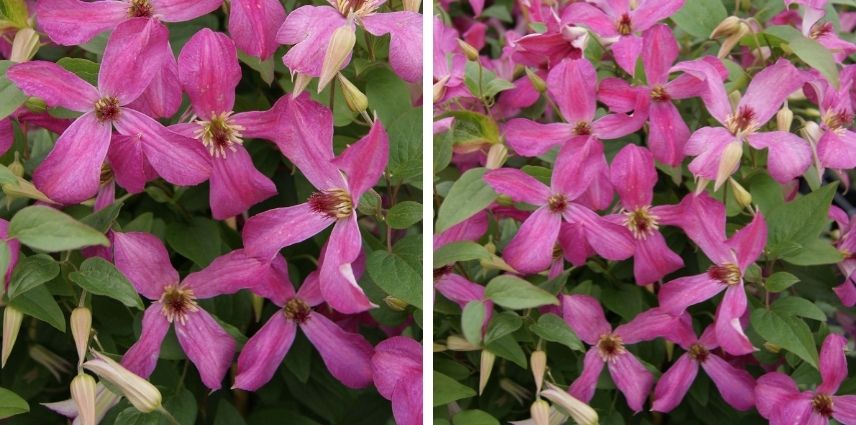 Ses belles fleurs étoilées à 4 branches, d’un rose-rouge chaud et brillant, rehaussées au cœur d’étamines crème mesurent entre 5 et 7 cm de diamètre. Les pousses apparaissent dès la fin du printemps et restent visibles jusqu’à la fin de l’été, toujours en abondance, comme c’est souvent le cas avec les clématites.