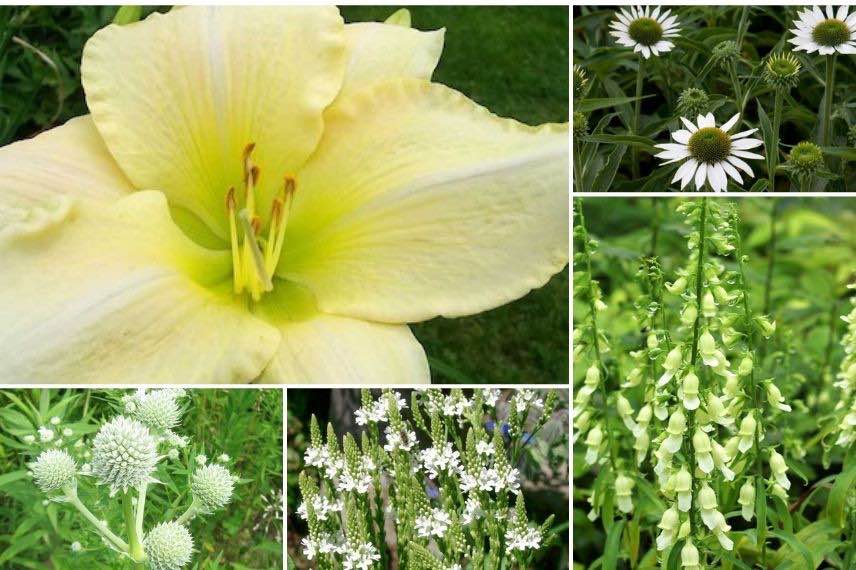 Hemerocalle ‘Snowy Apparition’, Echinacea ‘Purity’, Digitalis laevigata ‘Alba’, Verbena hastata ‘White Spires’, Eryngium yuccifolium