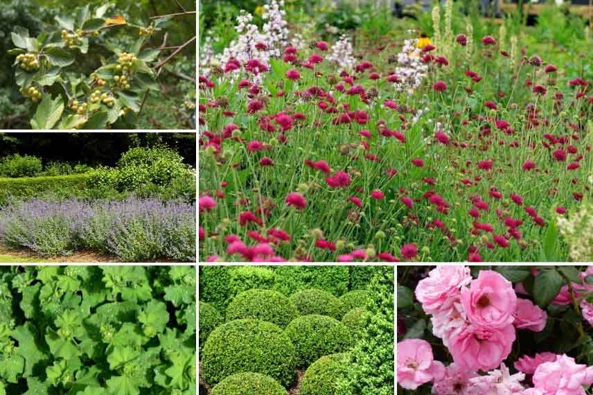 On imagine ici un jardinet clos, à l’allure à la fois naturelle et romantique, où la scabieuse vient apporter une touche vive et colorée. Ce jardinet peut être entouré d’Alisiers blancs Sorbus aria ‘Lutescens‘ palissés ou non, au-dessus de bordures de vivaces où se mêlent Knautia macedonica ‘Mars Midget’, au look ébouriffé et aux fleurs rose-pourpré, Nepeta faassenii ‘Six Hill Giant Gold’ dont la floraison bleu lavande contraste avec le feuillage gris-vert bordé de crème. En complément, les coussins duveteux de l’Alchemilla mollis dont la floraison vert glauque dynamisera l’ensemble. Les incontournables buis en topiaires Buxus microphylla ‘Faulkner’, coniques et en boules pour structurer le tout. Et pour habiller les murs : les cascades de fleurs du rosier grimpant ‘Bantry Bay’, délicatement parfumées, et le décor est posé !