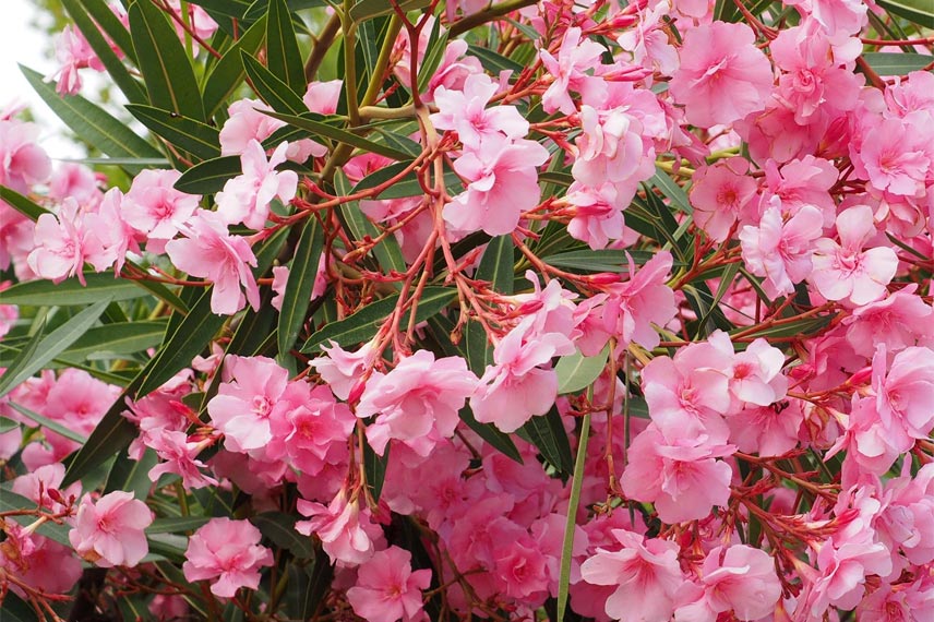 Malgré cette toxicité qu’il faut connaître, le laurier rose est la star des régions au climat doux. En effet, en été, cet arbuste florifère se pare d’une multitude de petites fleurs roses mellifères, jaunes, orange, rouges ou blanches. Typique des jardins méditerranéens, il se plait en sol bien drainé (voire sec), riche et en plein soleil. Le Nerium oleander est frileux mais il existe des variétés plus rustiques que d’autres comme le Nerium oleander ‘Rouge Double’ (-8°C, -10°C). Les régions les plus fraîches peuvent le cultiver en pot. Dès -5°C, il est conseillé de le rentrer ou de le protéger du froid avec une bonne couche de paillage et un voile d’hivernage. Vous pouvez installer le laurier rose au fond d’un massif, en haie variée ou en isolé. Résistant bien aux embruns, il compose souvent les haies de bord de mer.