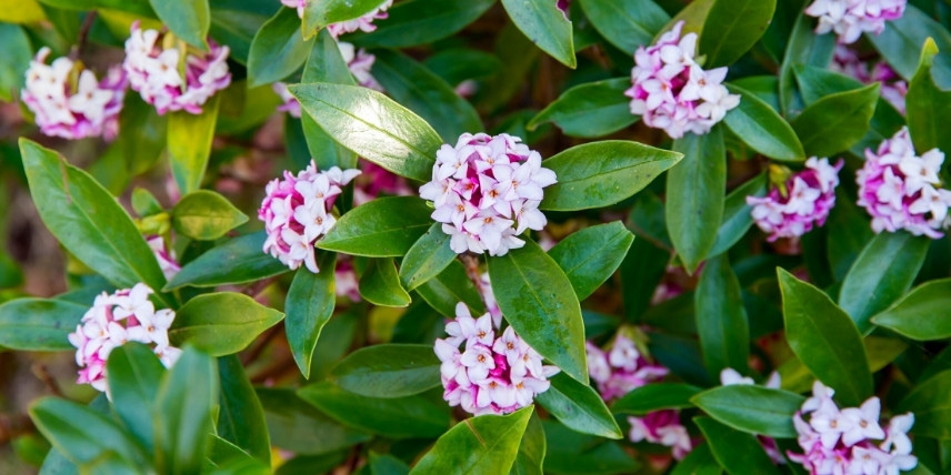 Le Daphne odora est un ravissant arbuste qui offre une longue floraison en fin d’hiver (février-mars), et donne alors des fleurs roses très parfumées. Il possède de belles feuilles allongées, vert foncé brillant, épaisses. C’est un arbuste de petite taille et qui pousse lentement, ce qui en fait un sujet idéal pour les petits jardins. Il ne dépasse pas 1,50 m de hauteur et d’envergure. Nous vous conseillons en particulier la variété Daphne odora ‘Aureomarginata’, qui possède de belles feuilles vert foncé soulignées par une délicate bordure jaune crème ! Vous pouvez également choisir le Daphne ‘Perfume Princess’, qui offre lui aussi un parfum enivrant. Il se montre encore plus compact, puisqu’il ne dépasse pas 1,20 m de hauteur pour 90 cm d’envergure.