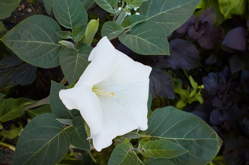 Cultivé en annuelle, le Datura est une plante buissonnante vivace à croissance rapide qui séduit les jardiniers par ses grandes fleurs estivales en trompettes blanches exhalant un parfum suave. Le semis du Datura vivace est facile; il apprécie les sols riches et drainés.