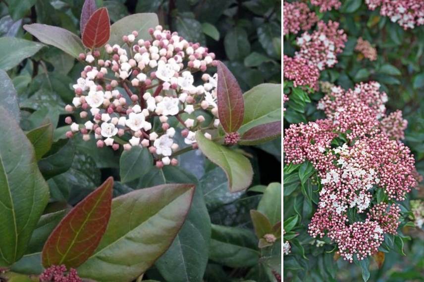 La viorne tin pourpre et ses belles inflorescences en cimes rondes rosées crèmes