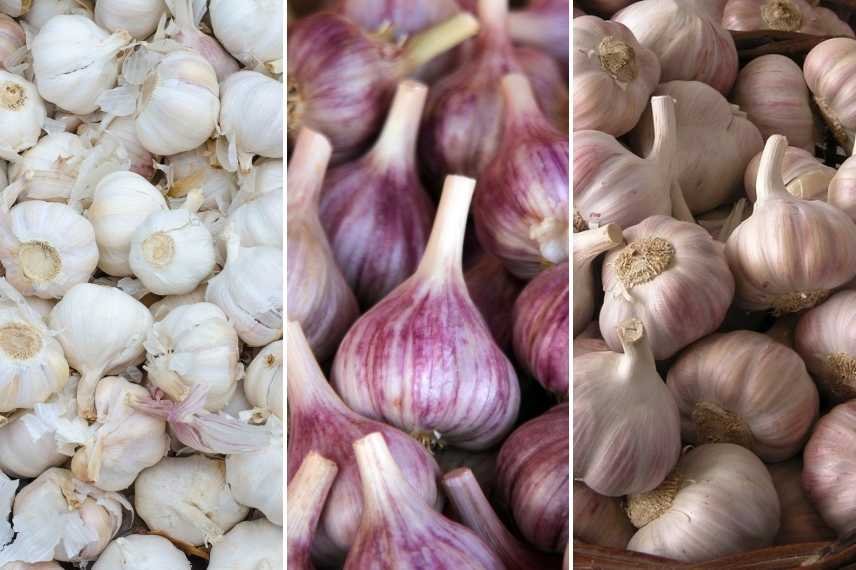 On peut cultiver l’ail en fonction de la couleur spécifique de ses caïeux. On distingue plus de 25 variétés d’ail qui se classent en 3 catégories : blanches, violettes ou roses. Ils se reconnaissent par la couleur de leurs tuniques. L’Ail blanc, tel que ‘Messidrome’ offre des bulbes très blancs aux gousses de couleur crème. Sous une tunique rose ou nacrée, l’ail rose (‘Arno’, ‘Flavor’), produit des caïeux à la chair blanche ou rose clair. Les bulbes d’ail ‘Germidour’ striés de violacé cachent des gousses blanc rosé. Certains comme le ‘Paradour’, se distinguent par une membrane blanche striée de violet renfermant des caïeux beiges légèrement bruns.