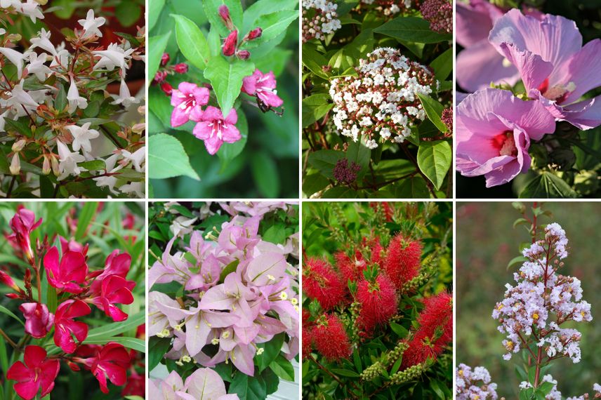 Exemples de haie libre : Abelia grandiflora, Weigelia ‘Bristol Ruby’, Hibiscus syriacus ‘Lavender Chiffon’, Viburnum tinus ‘Spirit’ (ligne du haut) et en climat doux, Nerium oleander, Bougainvillea ‘Rijnstar Lila’, Callistemon laevis, Lagerstroemia ‘Camaieu d’été’ (ligne du bas).