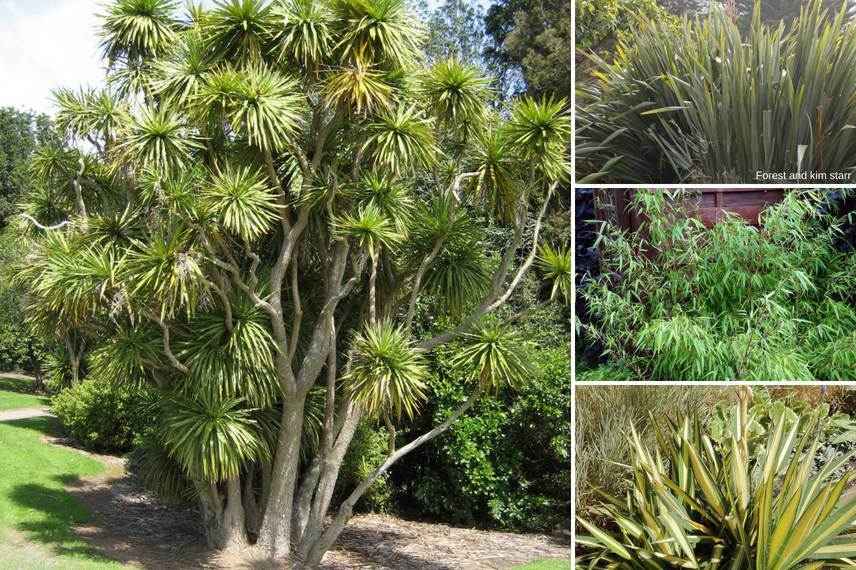 Quelques plantes à intégrer pour une ambiance exotique : Cordyline australis, Phormium tenax, Fargesia rufa ou Yucca filamentosa ‘Color Guard’.