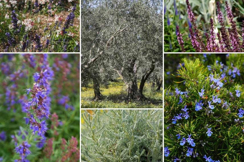 Quelques plantes à adopter pour créer une ambiance méditerranéenne : lavandes et gaura, Santolina chamaecyparissus, hysope, sauges, Stipa tenuifolia, romarin, avec des oliviers en toile de fond.
