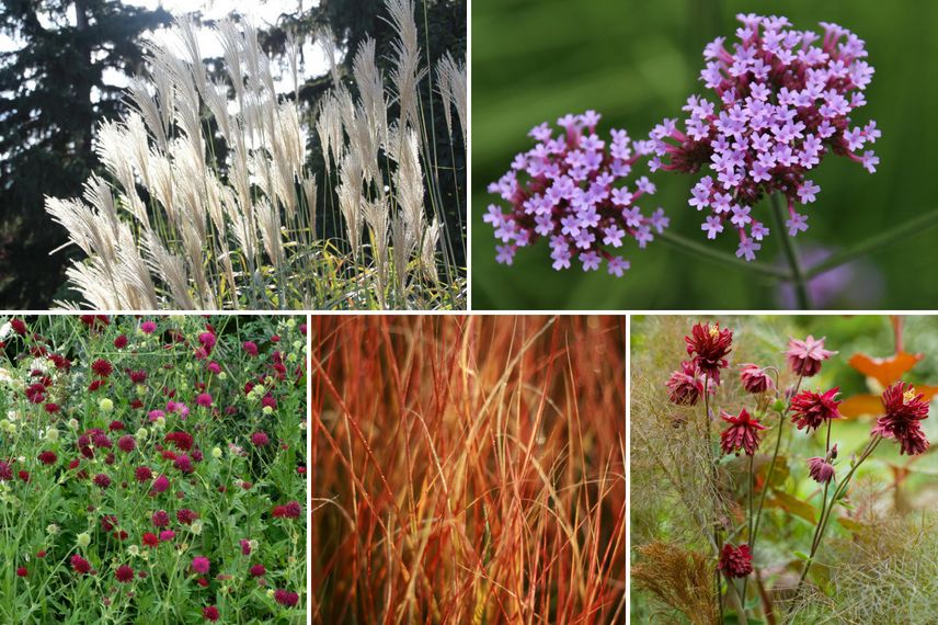 Quelques plantes pour une ambiance naturelle : Miscanthus, Verbena bonariensis, Knautia macedonia, Stipa arundinacea (Anemanthele lessoniana), Aquilegia vulgaris ‘Ruby Port’.