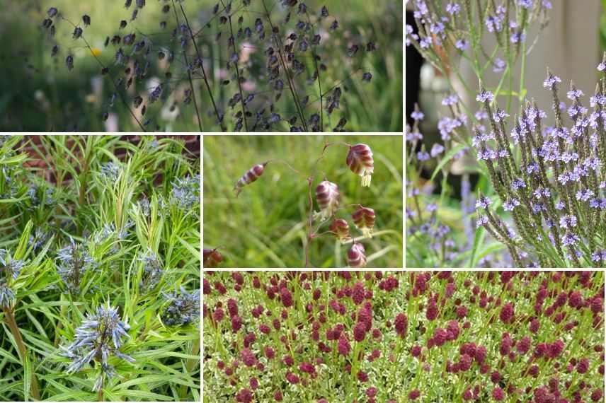 En haut l’amourette Briza media, détail de son inflorescence en forme de cœur au centre, en bas la pimprenelle Sanguisorba en floraison. À gauche l’Amsonia hubrichtii et son feuillage fin, à droite verveine Verbena hastata
