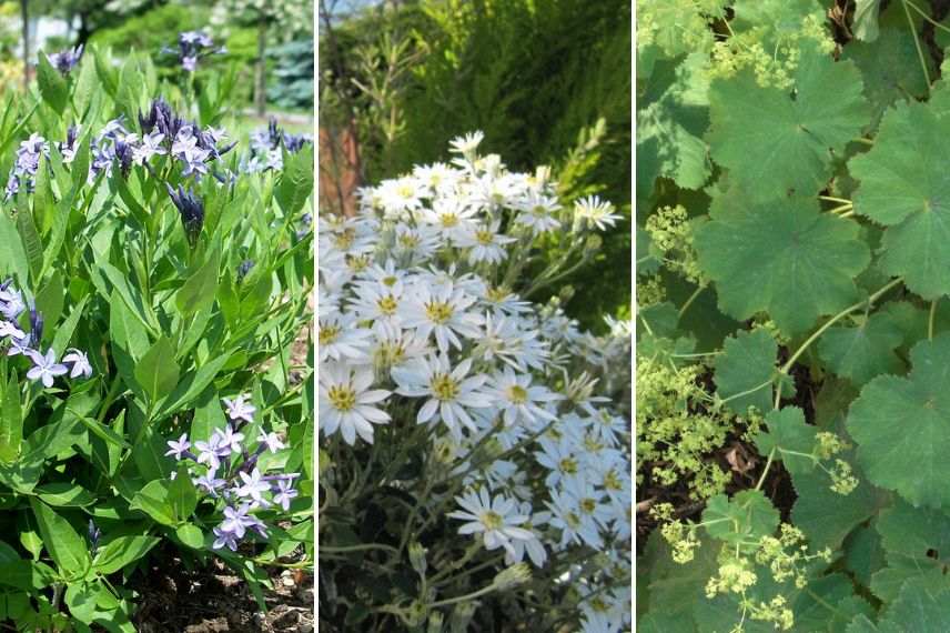 L’amsonia ‘Blue ice’ au port compact idéal en pot avec l’Olearia scillonensis au centre et à droite l’alchémille ‘Thriller’
