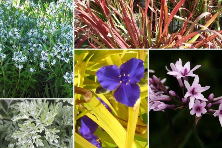 Ses longs boutons bleu ciel éclosent en petites étoiles bleu lilas, abondamment entre juin et juillet, pendant plusieurs semaines. Le feuillage de l’Amsonia prend alors une jolie couleur automnale, jaune vif en accord avec le Tradescantia andersoniana ‘Sweet Kate’ au feuillage fait de rubans dorés qui déploie une abondante floraison bleu intense. Jouez les contrastes avec le feuillage gris blanc découpé de l’armoise arborescente Artemisia arborescens ‘Powis Castle’ associé à celui de l‘Imperata cylindrica ‘Red Baron’ qui se teinte de rouge sang puis de rouge bordeaux dès les premières chaleurs estivales. Le Tulbaghia violacea ‘Purple Eye’ apporte par ses fleurs d’un rose frais porcelaine une touche de douceur.