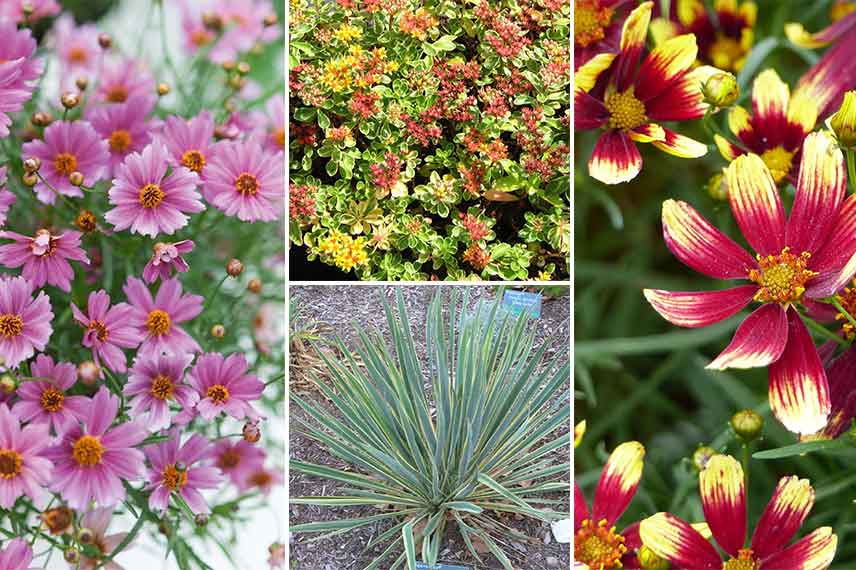 Coreopsis ‘Limerock Passion’, Sedum kamtschaticum, Yucca filamentosa ‘Bright Edge’ et Coreopsis verticillata ‘Bengal Tiger’ (de gauche à droite et de haut en bas)