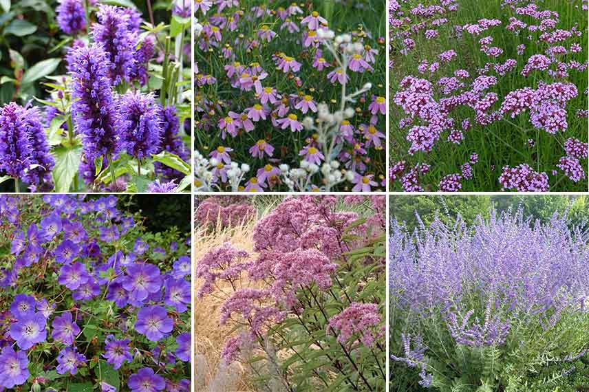 Agastache ‘Blue Boa’, Coreopsis rosea ‘American Dream’, Verbena bonariensis, Géranium ‘Rozanne’, Eupatorium maculatum ‘Atropurpureum’ et Perovskia ‘Blue Spire’ (de gauche à droite et de haut en bas)