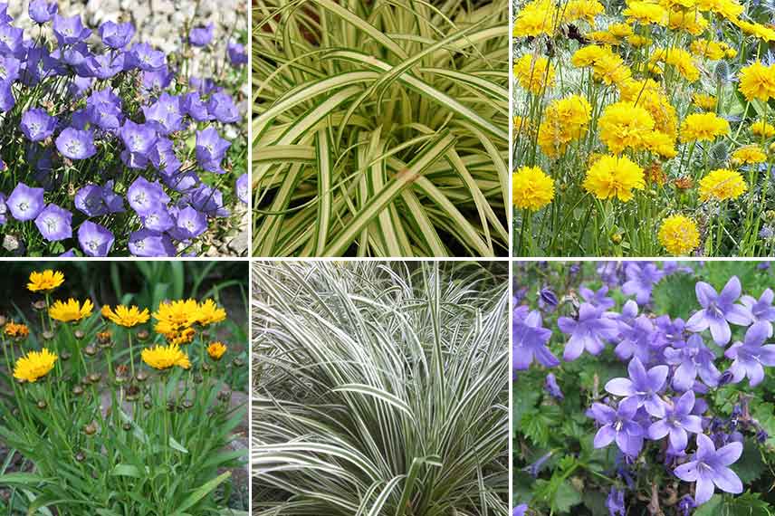 Campanula carpatica, Carex ‘Evergold’, Coreopsis ‘Early Sunrise’, Coreopsis ‘Sunray’, Carex ‘Everest’ et Campanula muralis (de gauche à droite et de haut en bas)